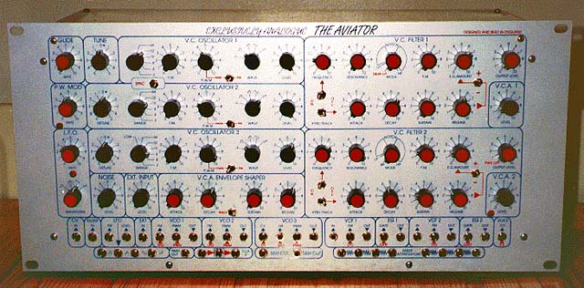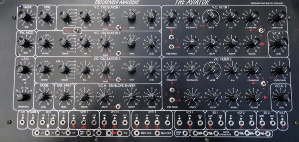 Exclusively Analogue is pleased to announce the return of The Aviator. This custom built analogue synthesizer module is the product of years of experience working with classic analogue synthesizers and combines some of the best features from many of these instruments. It is unique in its combination of Voltage Controlled Oscillators, Voltage Controlled Multi-mode Filters and patchability. A total of 50 knobs allow instant adjustment of all of the synthesizer parameters while 44 min jack sockets allow the sort of patchability normally only found on expensive Modular systems. The ‘Aviator’ is a CV and Gate instrument, just like its ancestors and contains no digital parts. It can be used in the midi environment by linking MIDI to CV convertor.